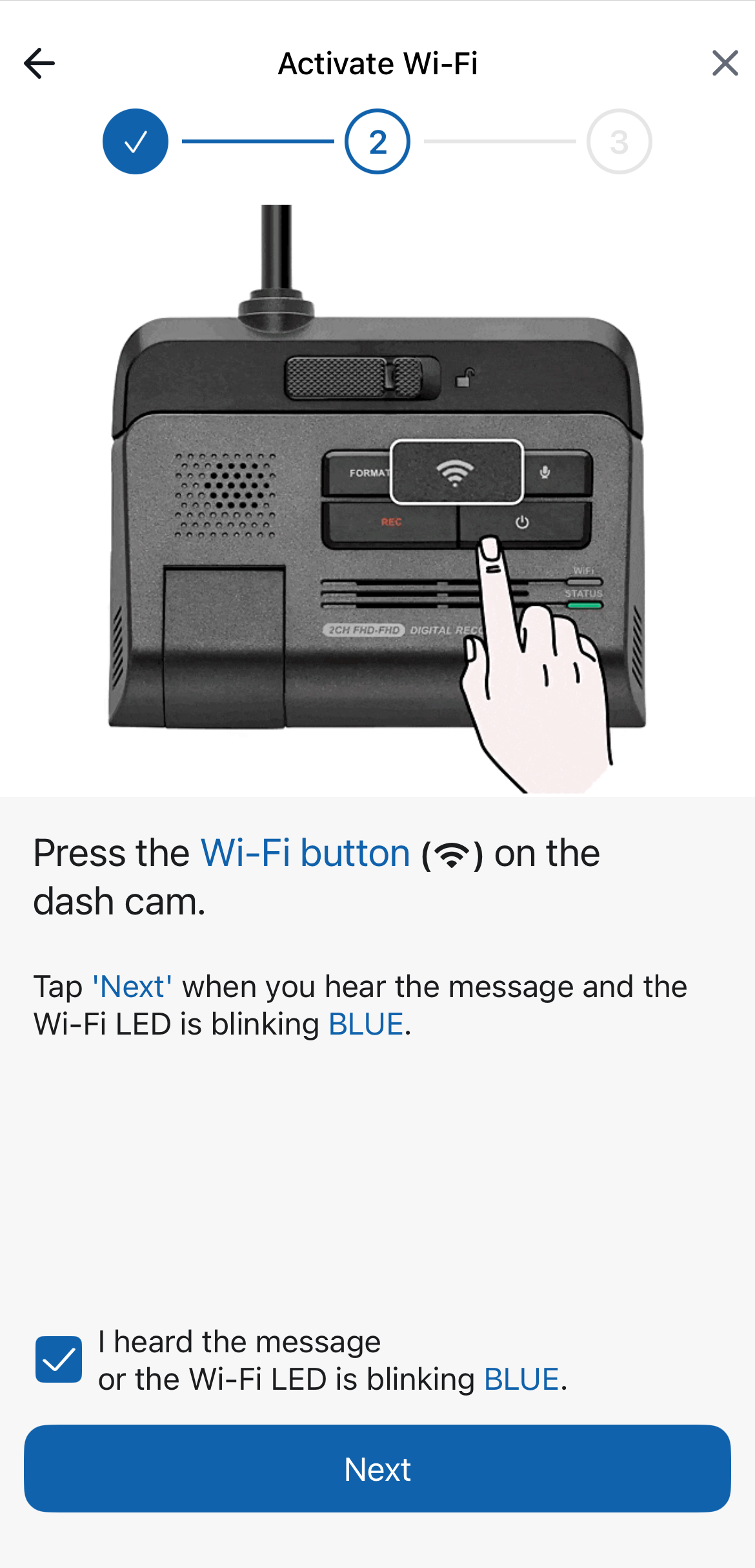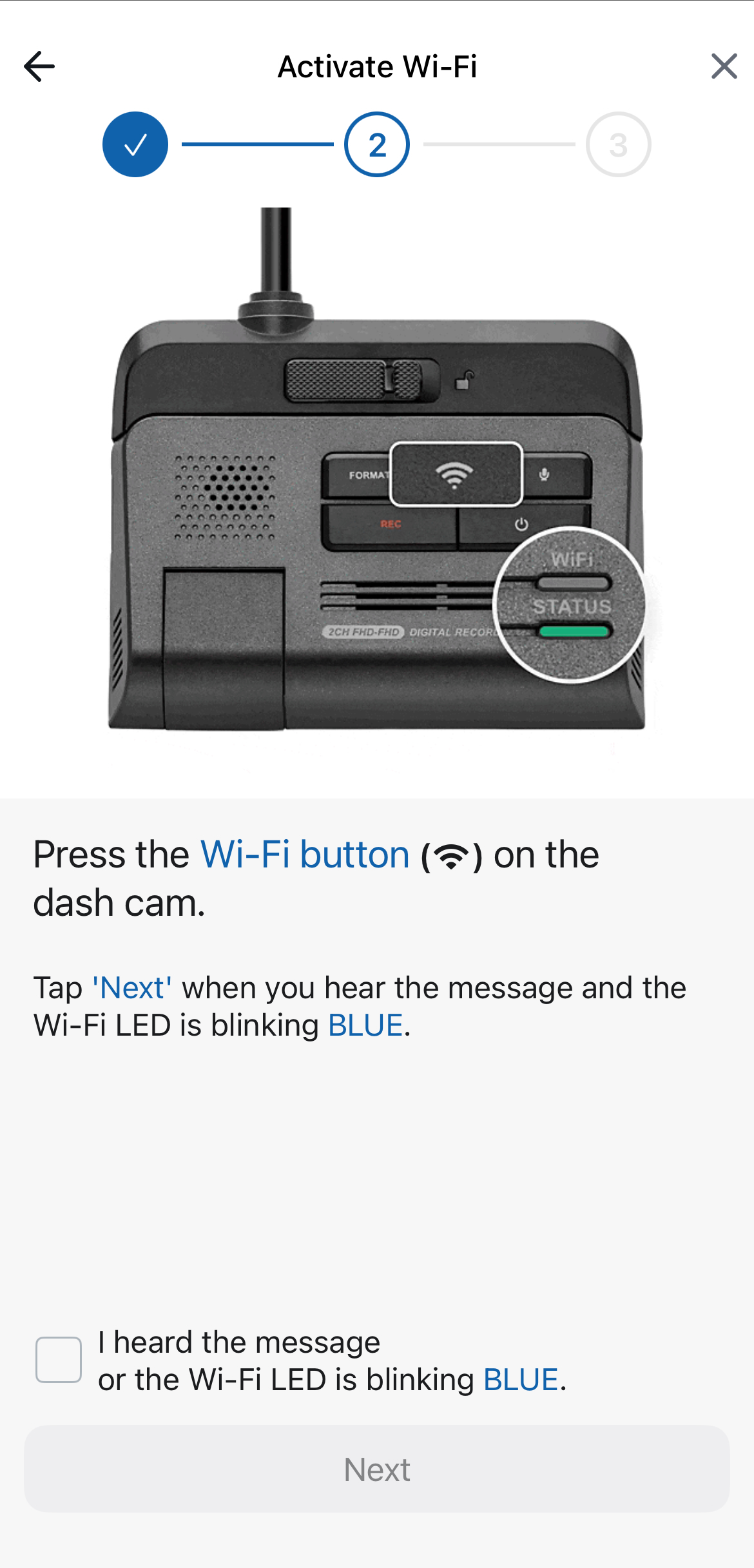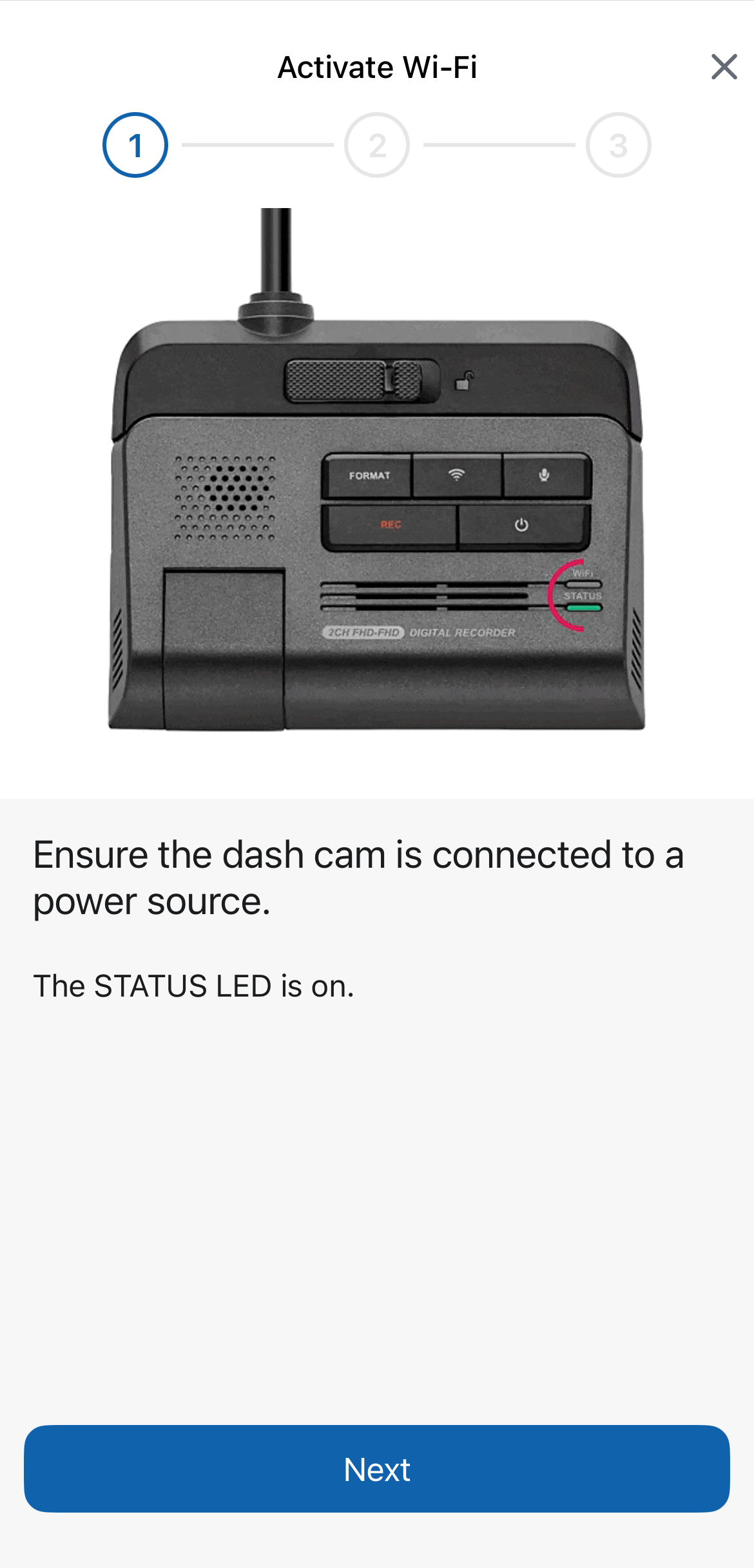 Confirm that the dash cam is powered on for the entire connection process. Hit 'Next' on the app to proceed