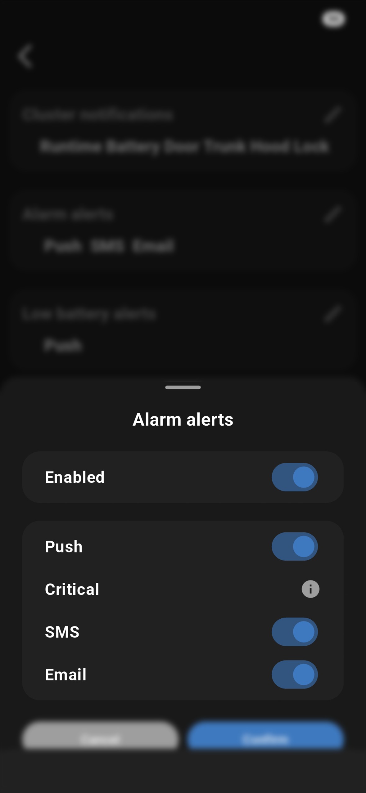 Touchez sur chaque élément que vous souhaitez recevoir une alerte (Push, Critique, SMS, Courriel) Le curseur deviendra bleu lorsqu'il est actif